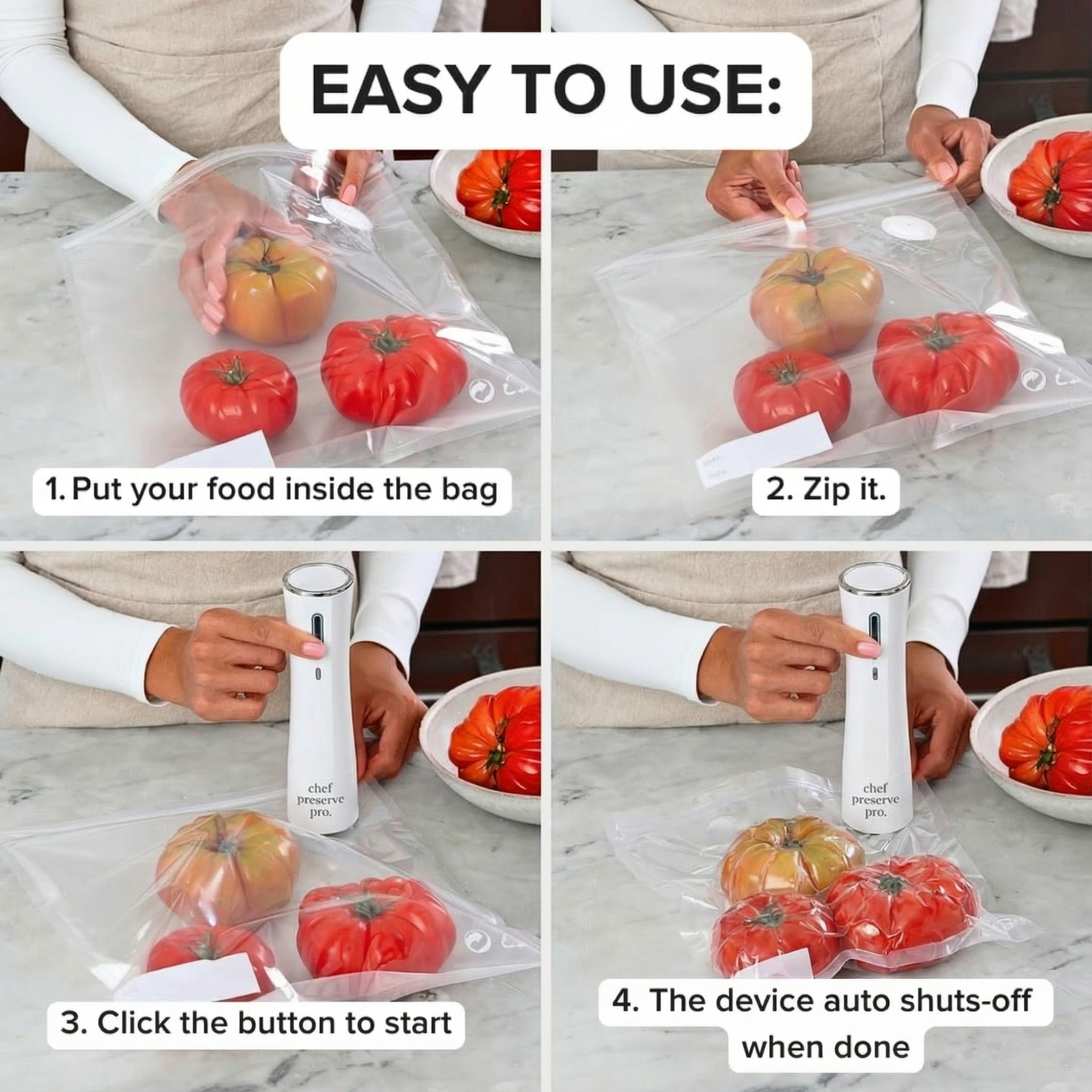 “I replaced my old countertop vacuum sealer with Chef Preserve Pro and appreciate how compact and easy it is to handle. It seals reliably, and I like that the reusable bags can be opened and resealed without damage.”